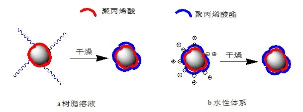 HT A20分子中的錨固部分由(甲基)丙烯酸、磷酸的均聚物或共聚物組成,通過和鈦白粉間的吸引力(配位作用、共價鍵)吸附在粒子表面,將粒子隔離開來。和樹脂相容的穩(wěn)定部分由丙烯酸酯、甲氧基聚丙二醇丙烯酸酯無規(guī)共聚物組成,賦予表面改性后的鈦白粉粒子良好的再分散性,并且能穩(wěn)定均勻分散在樹脂溶液和溶劑揮發(fā)后的樹脂中。在體系干燥過程中以及干燥后,和樹脂相容的部分能包覆在鈦白粉粒子表面,防止粒子聚集,使得鈦白粉粒子在樹脂中能均勻分散。圖2表示改性劑HT A20處理鈦白粉粒子后,HT A20在粒子表面的形態(tài)。圖2a表示在樹脂溶液或溶劑中,干燥前,改性劑的錨固部分和鈦白粉粒子間通過共價鍵、配位鍵結(jié)合在粒子表面上,聚丙烯酸酯部分充分伸展,通過空間位阻作用穩(wěn)定粒子;干燥后,聚丙烯酸酯部分包覆在粒子上或和樹脂基體互相滲透。圖2b表示在水性體系中,干燥前,改性劑的聚丙烯酸錨固部分和鈦白粉粒子間通過共價鍵、配位鍵結(jié)合在粒子表面上,依靠靜電斥力穩(wěn)定粒子;干燥后,聚丙烯酸酯部分包覆在粒子上或和樹脂互相滲透??梢?,雙親型嵌段聚合物改性劑HT A20對鈦白粉進(jìn)行有機(jī)表面處理后,在有機(jī)溶劑體系和水性體系中,都能提高鈦白粉在介質(zhì)中的分散穩(wěn)定性并改善鈦白粉和樹脂的相容性。